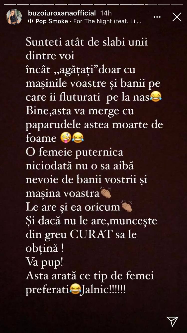 Roxana Buzoiu de la „ Puterea Dragostei ” a clacat pe contul ei oficial de socializare. Iubita lui Alex Turcu este profund deranjată și dezamăgită de bărbații care cred că pot să cumpere orice femeie cu bani și dacă se expun cu mașini scumpe în fața lor. „Sunteți atât de slabi unii dintre voi, încât „agățați” doar cu mașinile voastre și banii pe care îi fluturați pe la nas. Bine, asta vă merge cu paparudele astea moarte de foame. O femeie puternică niciodată nu o să aibă nevoie de banii voștri și mașina voastră. Le are și ea oricum. Dacă nu le are, muncește din greu CURAT să le obțină. Vă pup! Asta arată ce tip de femei preferați. Jalnic!” a zis Roxana Buzoiu.