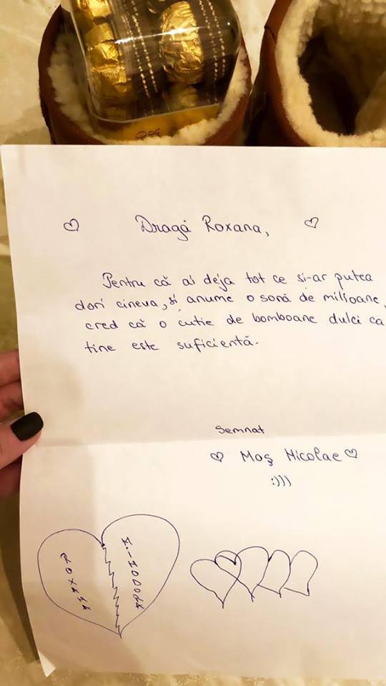 Scrisoarea pe care Roxana a primit-o este semnată de sora ei care-i spune că o cutie de bomboane e suficient, căci are o soră de milioane ce compensează orice cadou extravagant.
