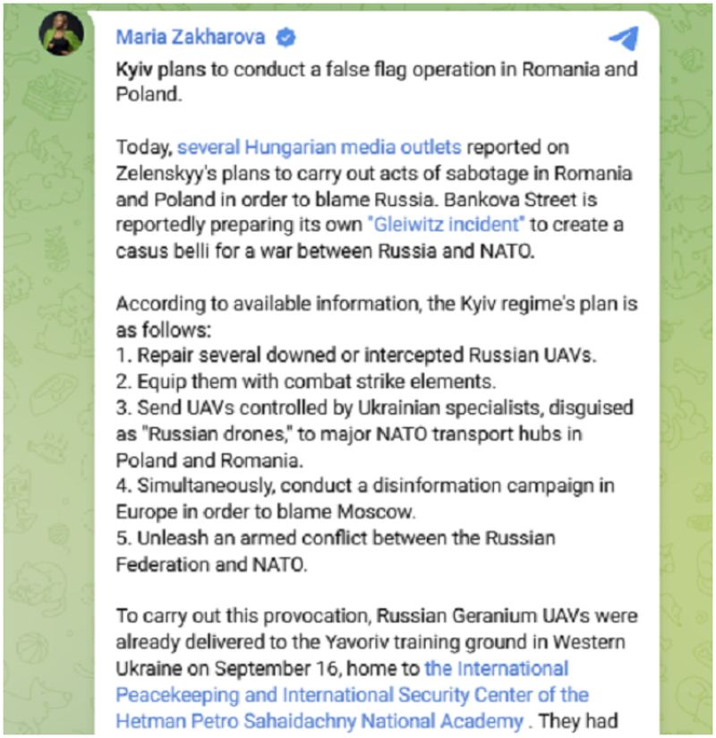 Maria Zaharova, purtătoarea de cuvânt a Ministerului de Externe de la Moscova, a publicat un mesaj alarmist pe Telegram în care scrie: "Kievul plănuiește să desfășoare o operațiune sub steag fals în România și Polonia".