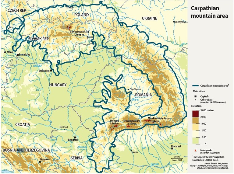 Munții Carpați formează un arc cu o lungime de circa 1.700 km și lățimea maximă de 130 km, desfășurându-se pe teritoriul a șapte state: Cehia (3%), Slovacia (17%), Polonia (10%), Ungaria (4%), Ucraina (11%), România (51%) și Serbia (4%).