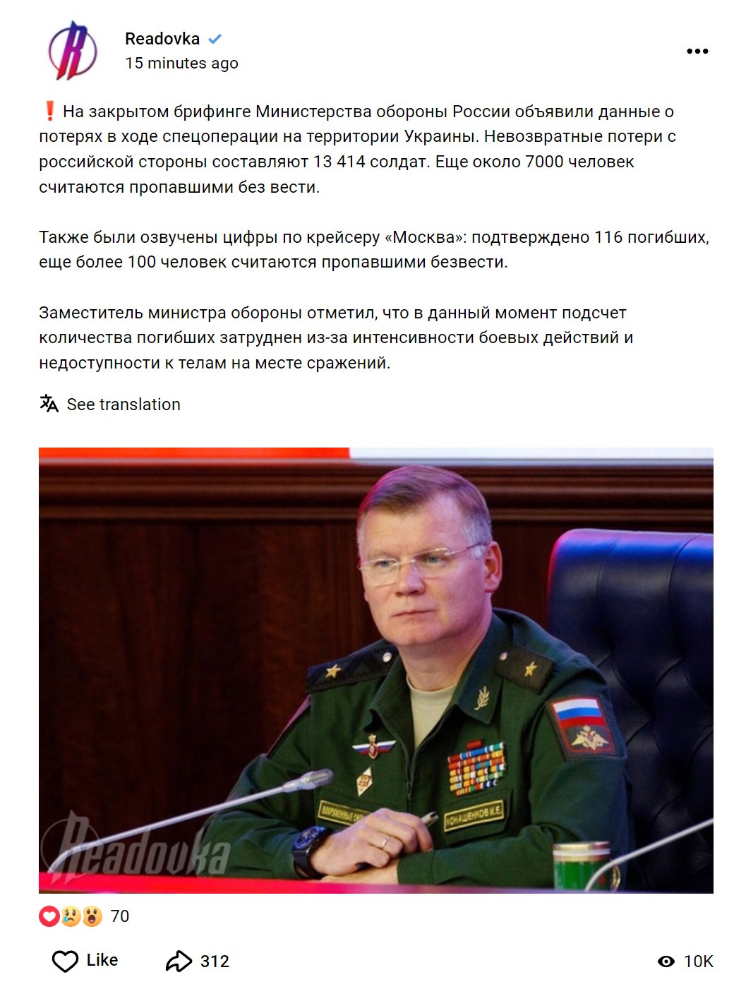 Pro-Kremlin resource Readovka reported about the death of 13,414 #Russian soldiers while around 7,000 are being missed. These numbers were announced at a closed briefing of #Russia 's Ministry of Defence. The post by Readovka has already been deleted.