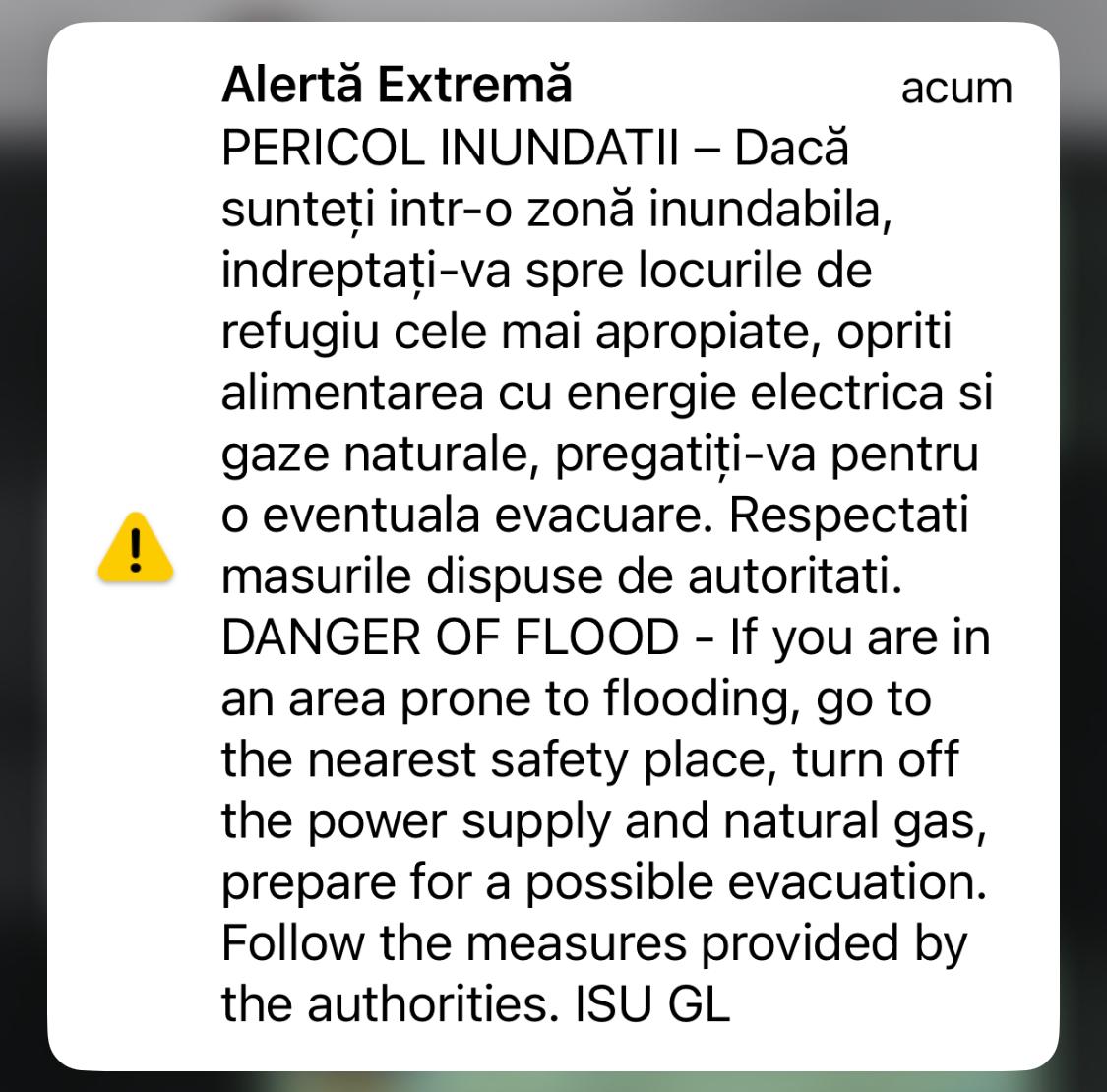 A fost emis un nou mesaj RO-Alert pentru a preveni locuitorii despre pericolul de inundații.