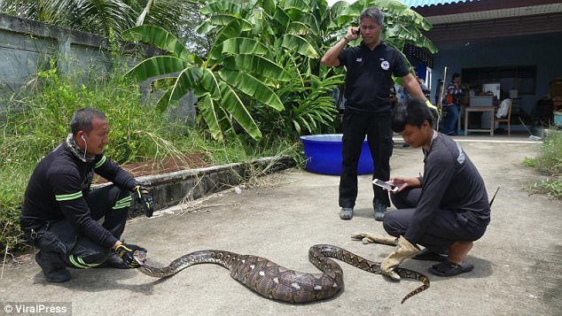 Saowarak Charoen (59 de ani) a avut un adevarat soc cand a intrat in casa si a vazut un piton lung de peste 5 metri care statea ghemuit pe blatul din bucatarie.