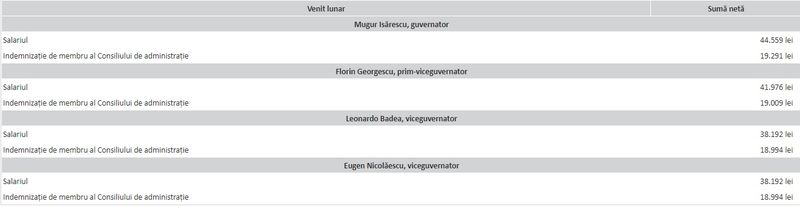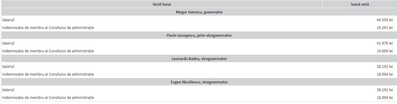 Potrivit site-ului Băncii Naționale, în plus față de salariul lunar, cei din conducerea executivă a BNR primesc şi alte venituri, după cum urmează: