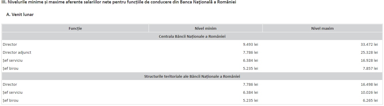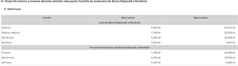 Ce salarii primesc directorii din BNR vezi în tabelul de mai jos. Directorii din Centrala BNR pot primi chiar și 33.000