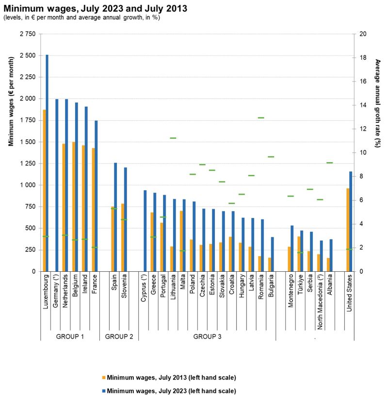 euro, Irlanda- 1.909 euro și Franța- 1.747 euro.În Spania, salariul minim este 1.260 euro pe lună. Datele se regăsesc în statistica Eurostat din iulie 2023 (linia albstră din tabelul de mai jos):