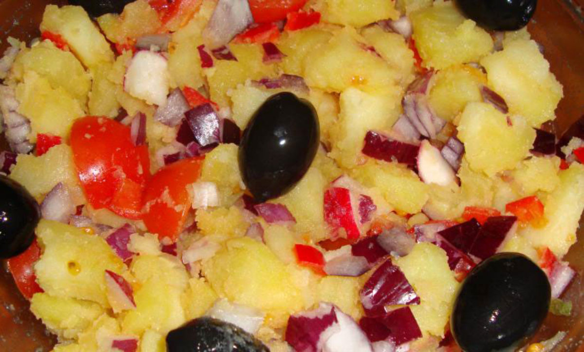 Salată orientală de post. Transferaţi cartofii fierbinţi în apă cât mai rece pentru uşura desprinderea cojilor. Decojiţi şi tăiaţi cartofii în rondele groase sau cuburi potrivite. Curăţaţi şi tăiaţi ceapa peştişori subţiri, scrie cevabun.ro.