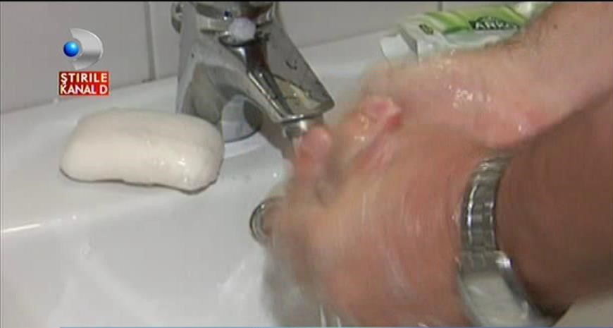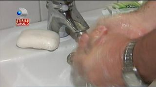 "Turnati sapunul lichid, anti-bacterian, puneti-va mainile sub apa si spalati-le bine."