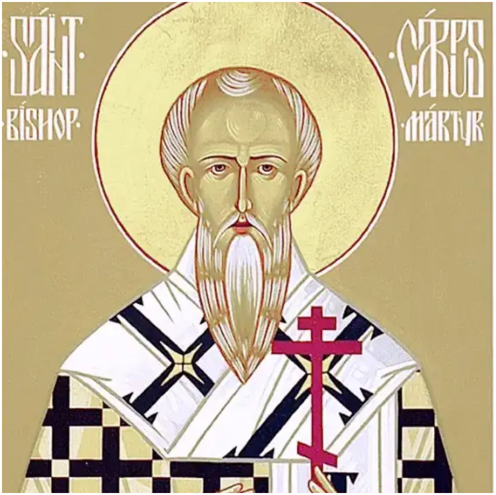 Biserica Ortodoxă Română îi prăznuiește tot acum pe Sfântul Mucenic Carp, episcopul Tiatirei, și pe Sfântul Papil. diaconul său.