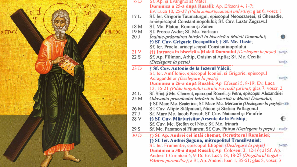 Pe 30 noiembrie 2025, ortodocșii prăznuiesc una dintre cele mai însemnate sărbători din an: Sfântul Apostol Andrei, cel întâi chemat dintre ucenicii lui Hristos și Ocrotitorul României. Este o zi marcată cu cruce roșie în Calendarul Ortodox și considerată atât o sărbătoare religioasă de mare importanță, cât și una încărcată de tradiții strămoșești.