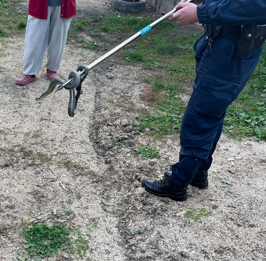 Ajunși acolo, în holul unei locuințe, jandarmii au descoperit un șarpe de aproximativ 2 metri. Reptila a fost capturată și eliberată în mediul natural.