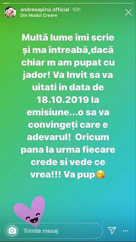 Sărutul dintre Jador și Andreea Pirui. Un nou scandal a luat amploare în casa „Puterea Dragostei”. Andreea Pirui este acuzată de fetele din casă de faptul că s-a sărutat cu Jador. „Multă lume îmi scrie și mă întreabă, dacă chiar m-am pupat cu Jador! Vă invit să vă uitați în data de 18.10.2019 la emisiune...o să vă convingeți care e adevărul. Oricum până la urmă fiecare crede și vede ce vrea! Vă pup!” a declarat Andreea Pirui de la „Puterea Dragostei”.