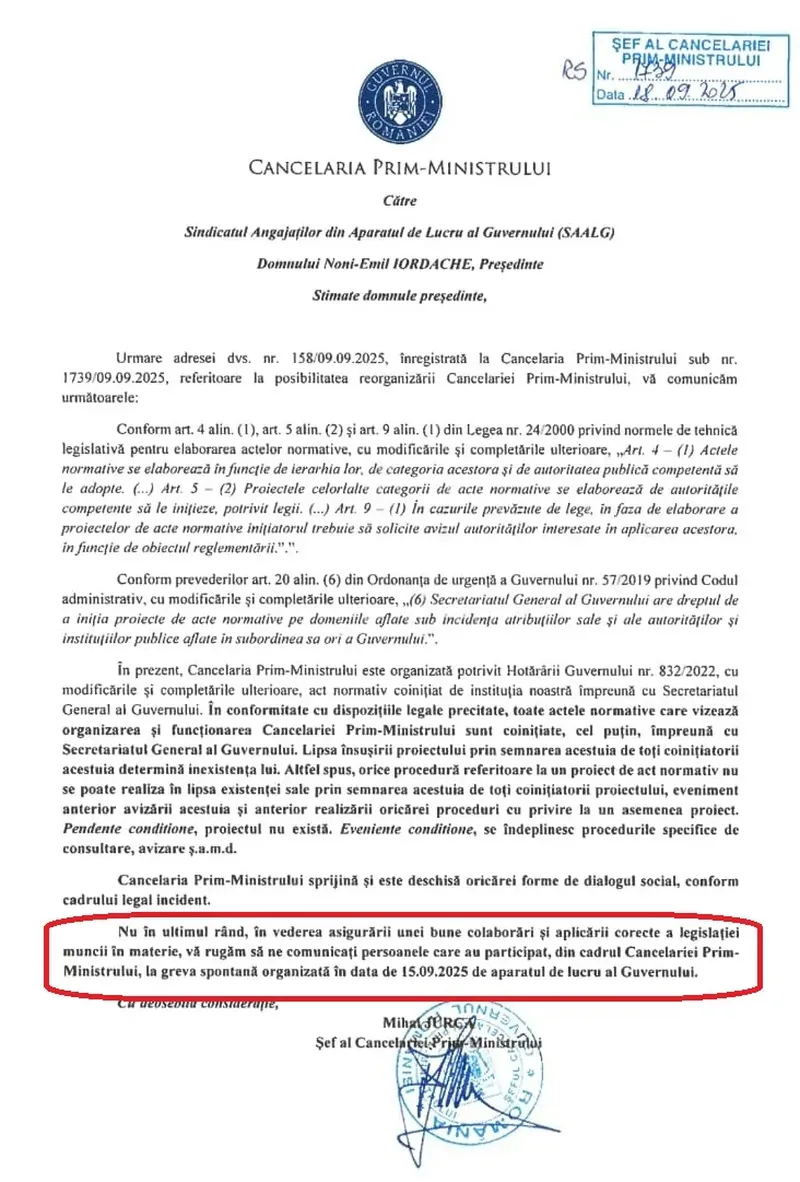 Sindicatul Angajaților din Aparatul de Lucru al Guvernului îl acuză pe Mihai Jurca, șeful cancelariei premierului Ilie Bolojan, că ar fi cerut liste cu angajații care au participat la protestul organizat luni, 15 septembrie, în Piața Victoriei. Sindicatul a făcut publică joi o adresă oficială semnată de Mihai Jurca, prin care se solicită numele celor care au luat parte la manifestația împotriva măsurilor de austeritate.