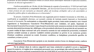 Aceștia avertizează că nu vor accepta transformarea cancelariei premierului într-un „instrument politic de control și frică”: „Nu vom permite ca această instituție să devină un loc unde democrația e redusă la adrese birocratice, iar drepturile fundamentale devin simple hârtii care încurcă.”