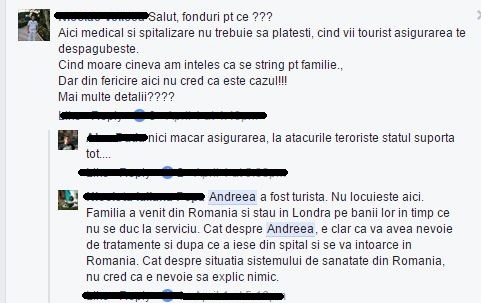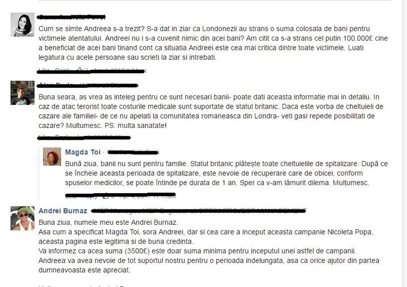 “As vrea sa inteleg pentru ce sunt necesari banii- poate dati aceasta informatie mai in detaliu. In caz de atac terorist toate costurile medicale sunt suportate de statul britanic. Daca este vorba de cheltuieli de cazare ale familiei- de ce nu apelati la comunitatea romaneasca din Londra- veti gasi repede posibilitati de cazare?”, este doar unul dintre cei care cere lamuriri cu privire la utilizarea banilor solicitati de familie