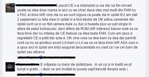 Si nu e singurul comentariu de acest fel: “E pacat ce s-a intamplat cu ea dar sa fim sinceri poate sa stea doar mama ei aici cu ea chiar daca stau mai multi din familie nu o fac ei bine, iar cine sta cu ea sunt sigura ca poate sta in spital. Eu am stat 2 saptamani cu fata mea in spital si a fost destul de OK adica camerele din spital sunt ca si un flat camera baie cu dus si toaleta plus un pat single in afara de patul bolnavului ,deci difera