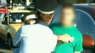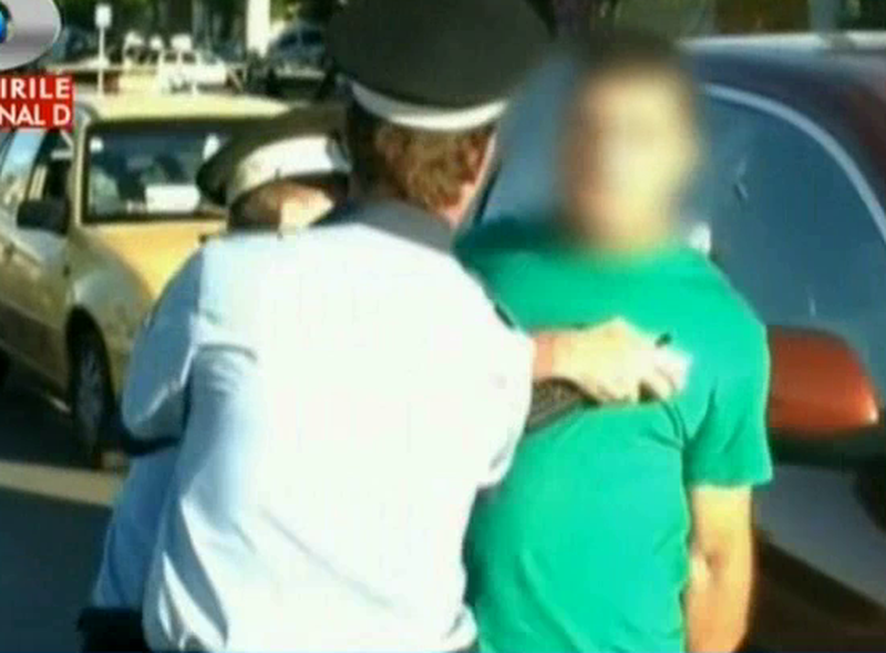 Parca turbat de furie, individul e hotarat sa-l doboare cu pumnii pe martorul "incomod". Noroc ca politistii intervin rapid cand vad ca soferul sare la bataie!