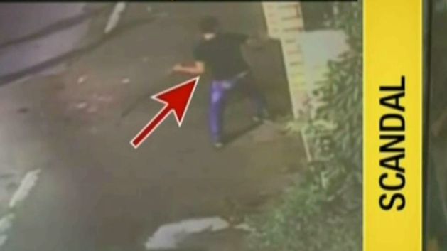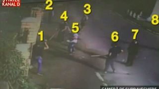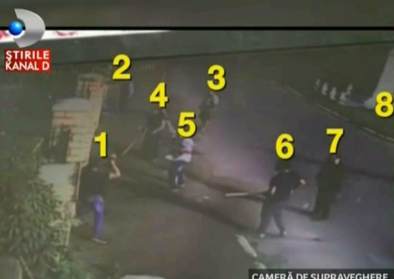 Primul care apare in imagini este un barbat. Aduna de pe jos mai multe obiecte si dispare pentru cateva secunde din cadru. Insa, camerele de supraveghere suprind momentul in care incepe asaltul cu bolovani.