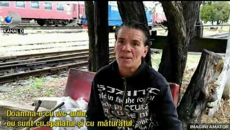 Aceasta femeie platita sa faca din toalete macar o incapere respirabila, trece ca prin branza prin vagoane. Nici vorba de mop, carpe cu dezinfectant sau vreun spray de sters geamurile.