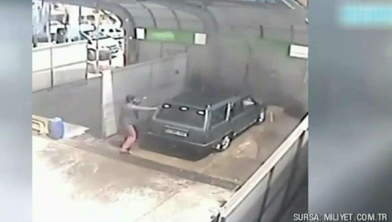 Barbatul din imagini nu s-a gandit ce il asteapta cand a tras la spalatorie. A platit si apoi s-a pus pe treaba pentru ca sistemul de aici permite fiecarui sofer sa-si spele singur masina.
