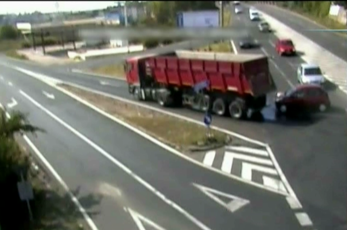 Ghinionul face ca fix in clipa impactului un TIR sa treaca prin sensul giratoriu!