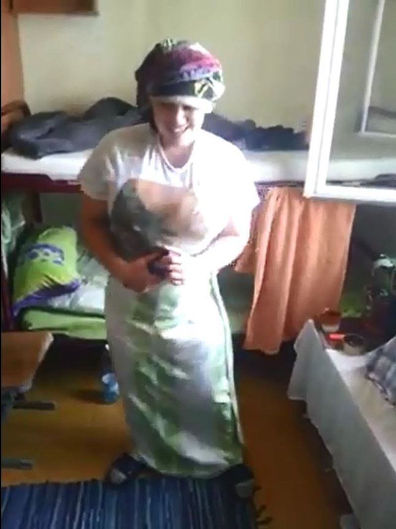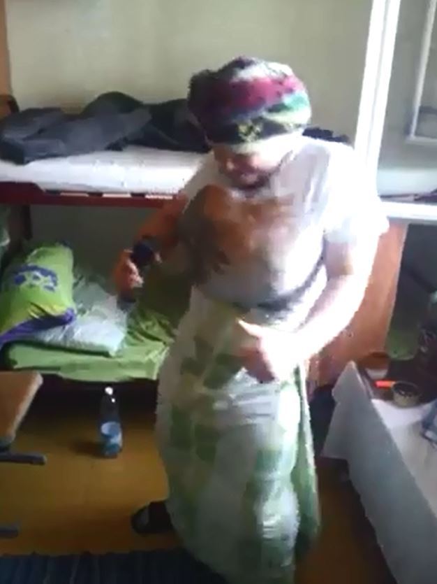 Barbatul si-a improvizat o fusta din prosoape, si-a indesat haine sub tricou, pe post de sani si foloseste un spray in loc de microfon. In acest timp, ceilalti detinuti se amuza si il filmeaza cu telefoanele mobile.