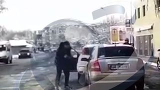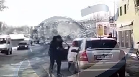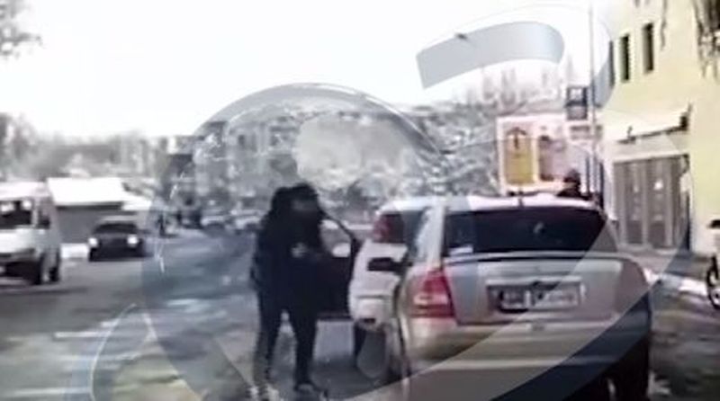 In imagini se observa cum individul de 29 de ani, parca turbat si inarmat cu o baioneta, il loveste de mai multe ori pe soferul masinii.