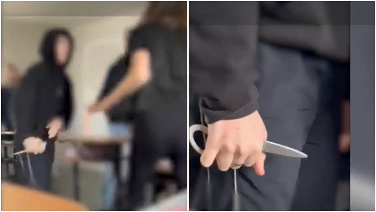 Elevul în vârstă de 13 ani a fost filmat luni la școala din comuna Peciu Nou, ținând o foarfecă îndreptată spre o colegă de clasă.