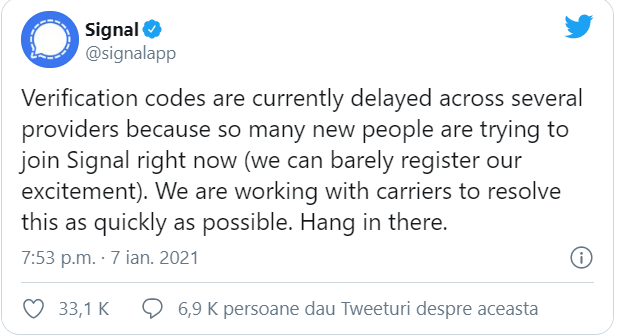 După această postare, mai mult de 100.000 de utilizatori au descărcat Signal din secțiunile de aplicații de la Apple și Google în mai puțin de două zile. Numărul mare de solicitări a făcut ca platforma să cadă în unele momente, iar codurile de verificare pentru descărcare să fie trimise cu întârziere. Dar s-a rezolvat repede și utilizatorii „n-ar mai trebui să aibă probleme în instalare”.