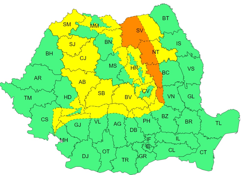 Judeţele avertizate cu Cod galben sunt: Suceava (jumătatea de est), Neamţ (jumătatea de est), Buzău (nord), Prahova (nord), Dâmboviţa (nord), Argeş (nord), Vâlcea (nord), Gorj (nord), Mehedinţi (nord), Caraş- Severin (est), Hunedoara (sud), Sibiu, Braşov, Alba, Cluj, Sălaj, Satu Mare, Maramureş (vest, sud şi est), Braşov (est), Mureş (est), Harghita (centru şi est), Covasna (sud, nord şi est).