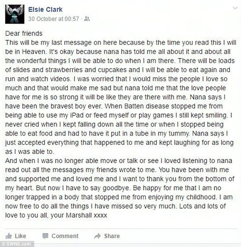 Marshall Clarks, un baietel in varsta de 7 ani din Devon, Mare a Britanie a incetat din viata din cauza unei boli rare, pentru care nu exista tratament, numita boala Batten. Inainte de a muri, el le-a lasat o scrisoare emotionanata de rama-bun prietenilor.