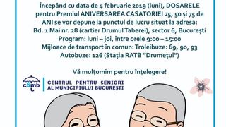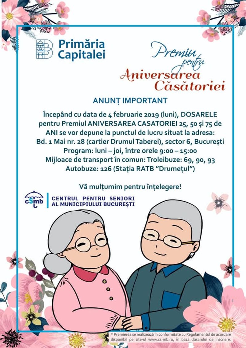 Astfel, începând cu data de 4 februarie 2019 (luni), DOSARELE pentru Premiul ANIVERSAREA CASATORIEI 25, 50 și 75 de ANI se vor putea depunde la Centrul pentru Seniori al Municipiului București.