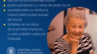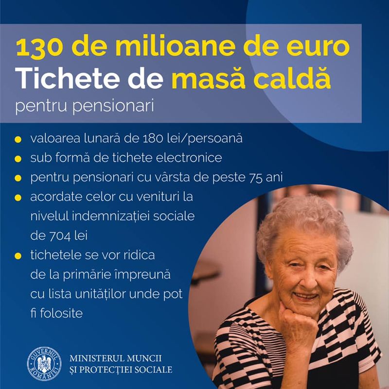 Ministrul Muncii, Violeta Alexandru, a anunțat miercuri dimineața că fiecare pensionar cu pensia minimă și vârsta de peste 75 de ani urmează să primească 180 lei pe lună sub forma tichetelor de masă electronice. Programul finanțat din bani europeni totalizează 130 de milioane de euro.