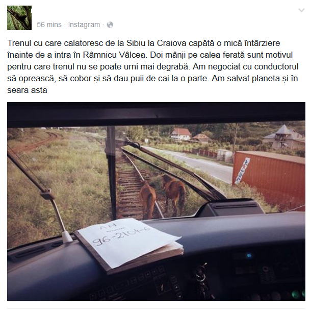 Un utlizator de Facebook a postat pe contul personal o poveste senzationala. Omul se afla in trenul care circula intre Sibiu si Craiova si a asistat la o intarziere provocata de doi cai ce pasteau nestingheriti pe calea ferata.