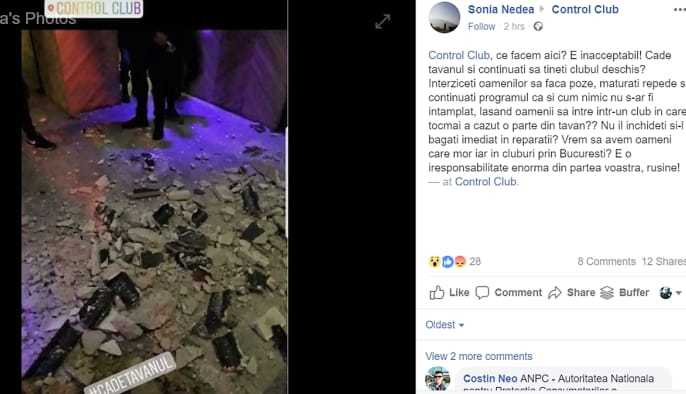 "Imagine din Club Control, aseara. Dupa cum puteti vedea, o bucata de tavan cazuta in timpul programului. Masurile luate de club? Maturat repede si continuat seara ca si cum nimic nu s-ar fi intamplat, lasand oameni sa mai intre in club, in loc sa il inchida imediat si sa il redeschida doar dupa ce au facut reparatii serioase! E inacceptabil sa se intample asa ceva.