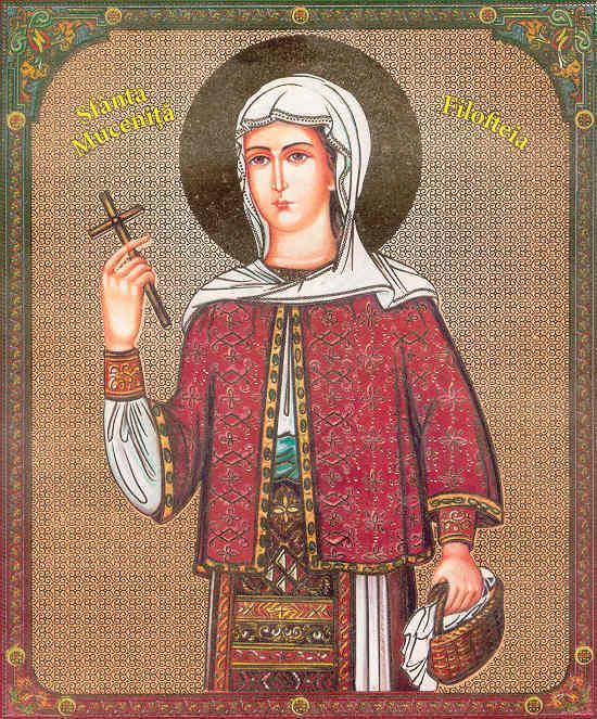 Sfântă mare muceniță a lui Hristos, Filoftee, ne rugăm ție cu genunchii plecați și cu lacrimi fierbinți. Adu-ți aminte de neputința firii omenești, care cuprinde și împresoară pe tot muritorul, de la naștere, întocmai ca mrejele păianjenului. Întru aceste mreji fiind căzuți și noi, smeriții, și neputând scăpa de ele fără ajutorul lui Dumnezeu, te rugăm pe tine să ne fii mijlocitoare către Dânsul.
