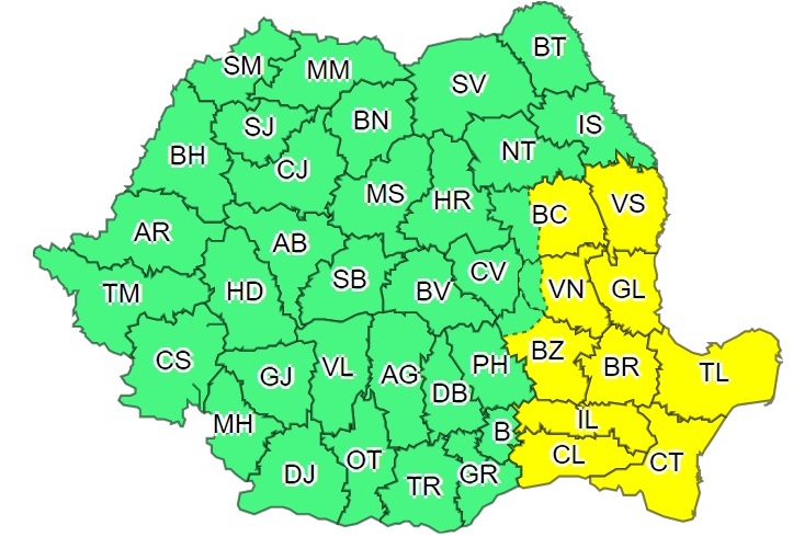Judeţele atenţionate de meteorologi sunt: Bacău, Vaslui, Vrancea, Galaţi, Buzău, Brăila, Tulcea, Ialomiţa, Călăraşi şi Constanţa.