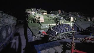 8 din 12 | Primele elemente de tehnica militara ale detasamentului SUA Task Force (TF) Cougar se regrupeaza dupa intrarea in Romania, intr-o parcare din apropierea Punctului de Trecere a Frontierei Nadlac, 9 februarie 2022.