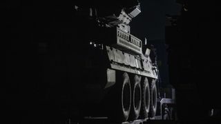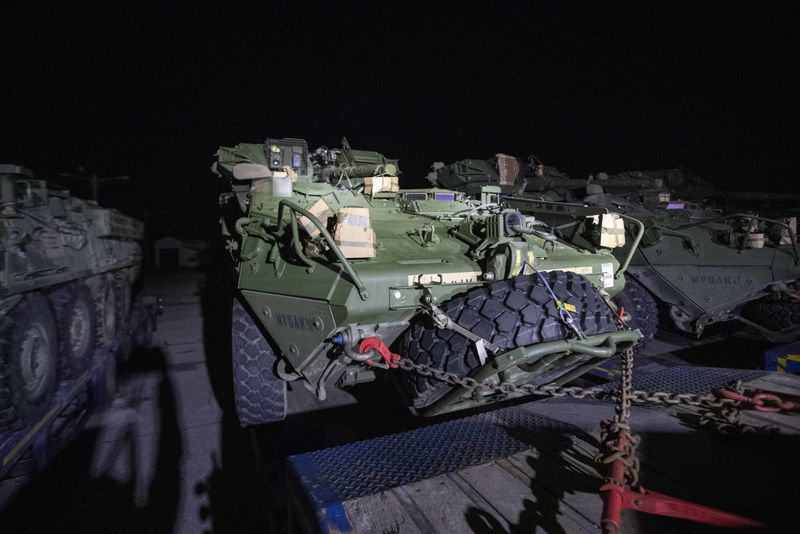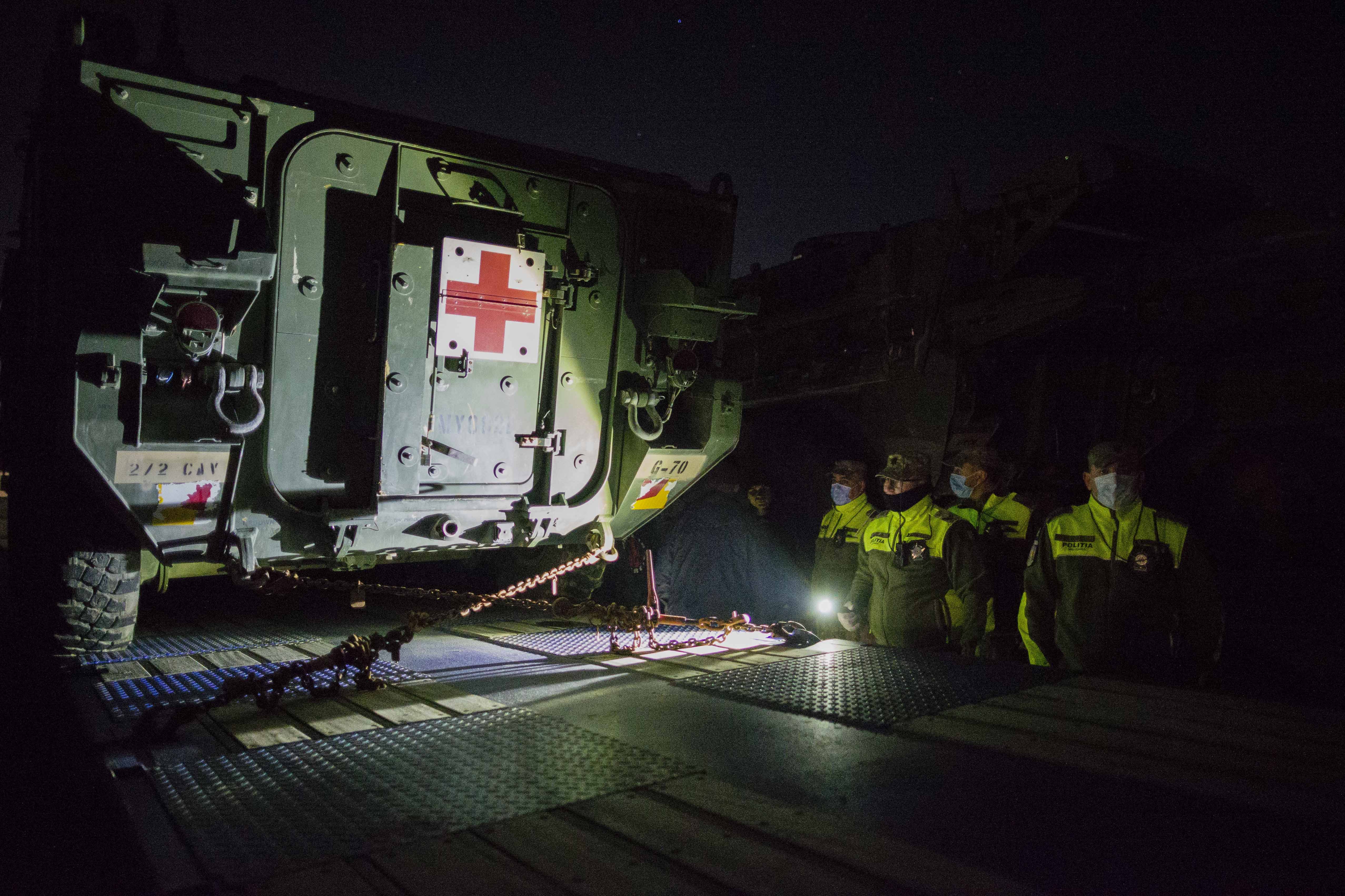 12 din 12 | Primele elemente de tehnica militara ale detasamentului SUA Task Force (TF) Cougar se regrupeaza dupa intrarea in Romania, intr-o parcare din apropierea Punctului de Trecere a Frontierei Nadlac, 9 februarie 2022.