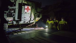 5 din 12 | Primele elemente de tehnica militara ale detasamentului SUA Task Force (TF) Cougar se regrupeaza dupa intrarea in Romania, intr-o parcare din apropierea Punctului de Trecere a Frontierei Nadlac, 9 februarie 2022.