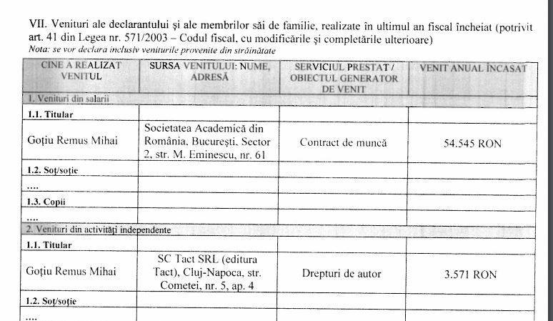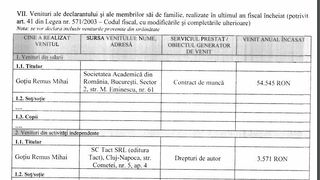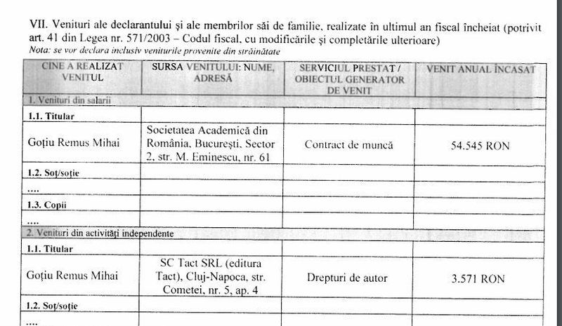 Mai exact, veniturile salariale incasate anul trecut de Gotiu de la Societatea Academica din Romania, unde senatorul a fost angajat cu carte de munca, au fost de 54.545
