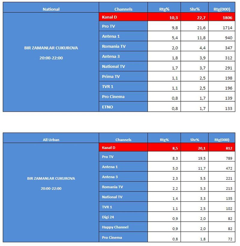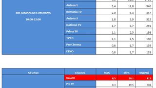 Kanal D a acaparat peste 20% cota de piata, pe doua targeturi, National si All Urban, in Prime Time
