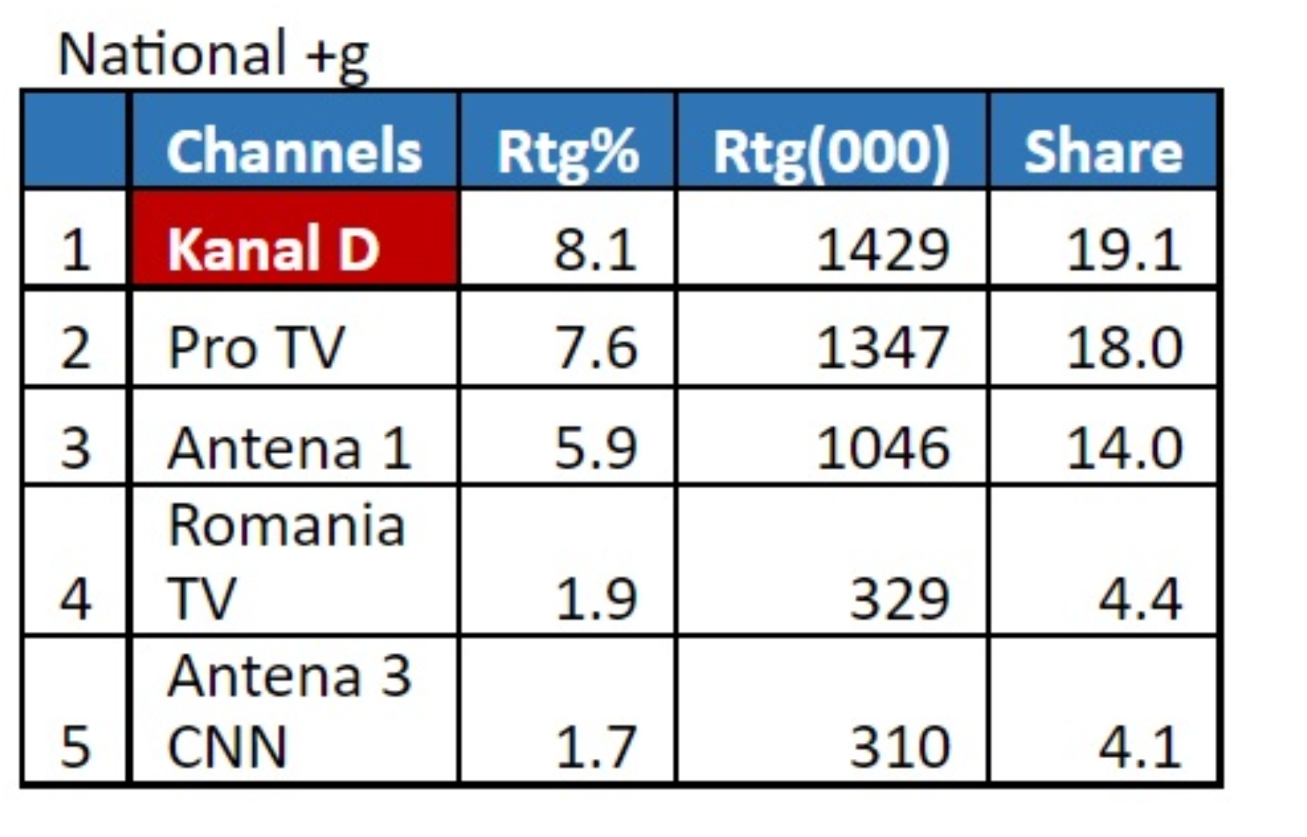 Astfel, ieri, în intervalul de difuzare a serialului 20:00 – 22:30, Kanal D a fost lider de piață, înregistrând 8,1% rating și 19,1% cota de piață, pe targetul Național.