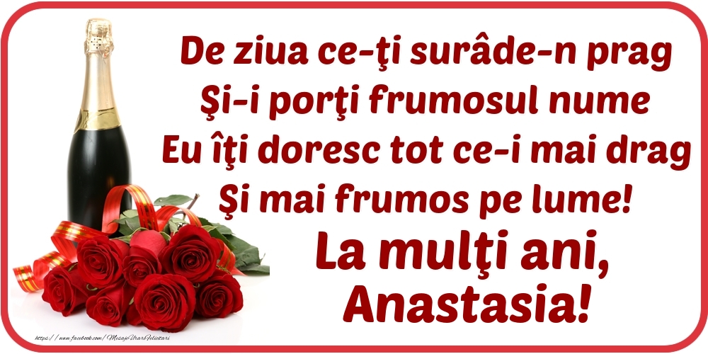 „Sfânta Anastasia să te călăuzească mereu! La mulți ani! Sfânta Anastasia să te călăuzească mereu, să-ți dea un munte de sănătate, o mare de iubire și un ocean de fericire.”
