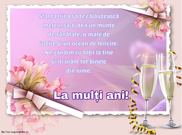 De ziua numelui tău îți doresc să ai parte de succes, împliniri și sănătate. Sfânta Irina, al cărei nume îl porți, să te ocrotească și să te călăuzească în viață. La mulți ani!