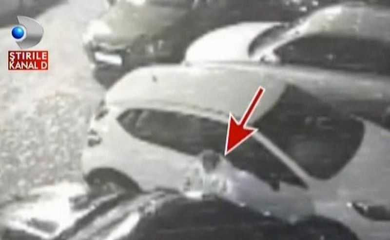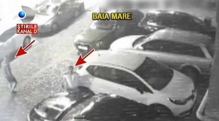 Dupa ce geamul din spate al masinii se sparge, omul o ia la fuga! Numai ca toata actiunea a fost surprinsa de o camera de supraveghere iar imaginile au fost duse de proprietarul autoturismului la politie.