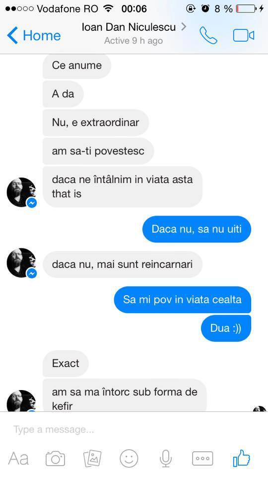"Am să-şi povestesc, dacă ne întîlnim în viaţa asta, dacă nu, mai sunt reîncarnări” a scris Ioan Dan Niculescu, iar după replica interlocutoarei, a răspuns din nou, parca ”codificat”. ”Exact, am să mă întorc sub formă de kefir”.