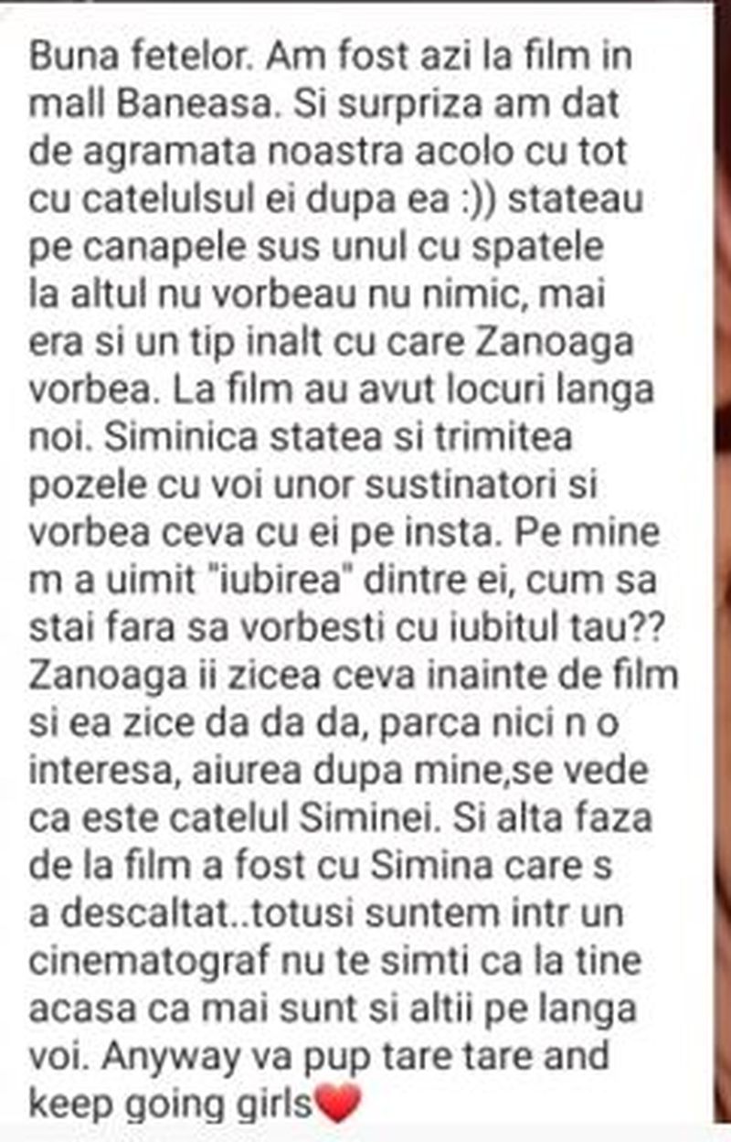 "Stăteau unul cu spatele la celălalt, nu vorbeau, nu nimic. Cu ei mai era un băiat cu care vorbea Zănoagă. La film au avut locuri lângă noi. Siminica stătea și vorbea cu susținătorii.