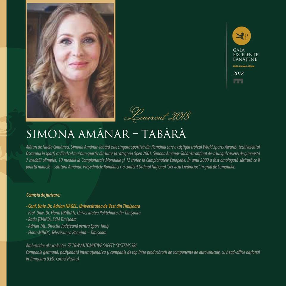 Simona Amânar Tabără (39 de ani) a făcut istorie în gimnastică, fiind multiplu medaliată olimpică, mondială şi europeană, palmaresul ei numărând 7 medalii olimpice şi 10 mondiale. În prezent arbitru de gimnastică, Amânar- căsătorită şi mamă a 3 copii- a fost distinsă zilele trecute cu un Premiu de Excelenţă la ”Gala Excelenţei Bănăţene”. Atunci când a rostit discursul de mulţumire, Simona a impresionat asistenţa cu ţinuta ei foarte elegantă.