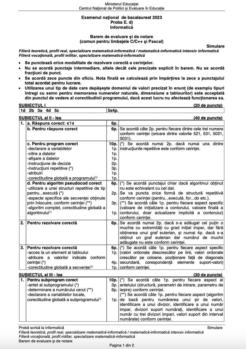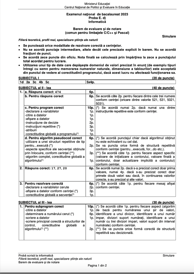 Modele și baremul de corectare pentru simularea la Informatică a Examenului Național de Bacalaureat 2023, pot fi găsite pe site-ul Ministerului Educației subiecte.edu.ro .
